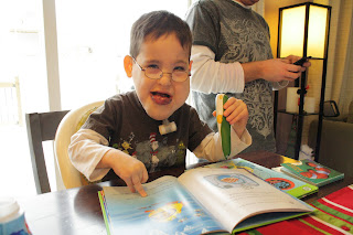 He LOVES his TAG reader. I think that's his favorite present this year. It's a little pen that you run over a word and it says it for you. You can also push on pictures and it will talk to you. Landon doesn't do much of the "reading" part of it yet, but he loves to push on the pictures to see what they say. It's a really cool toy. Landon had a lot of fun with it after we had a chance to clean up and play with it....